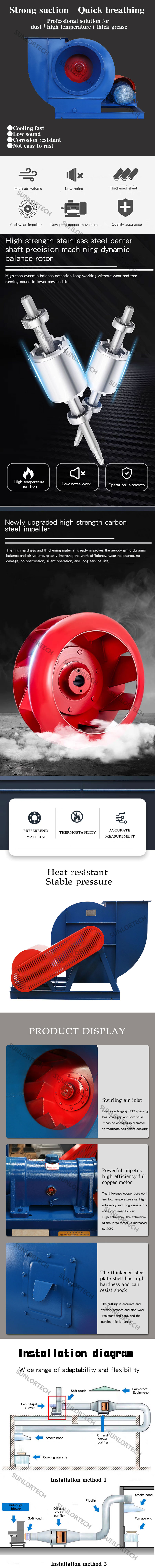 -Impeller: 10 backward inclined wing type blades are welded between the arc-shaped wheel cover and the flat wheel disc, and dynamic balance correction is carried out to run smoothly and efficiently.