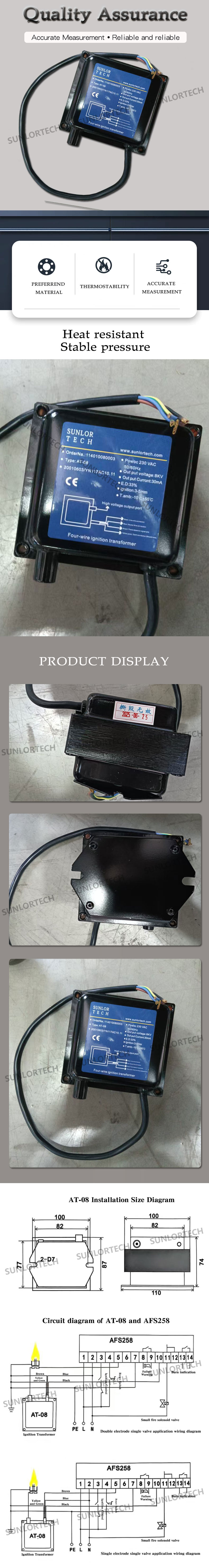 Overview: The AT-08 is a high-energy ignition transformer known for its reliable ignition. It is suitable for integrated burners, radiant tube burners, high-speed burners, and industrial furnaces, capable of igniting gases such as natural gas, coke oven gas, and blast furnace gas. The AT-08 features high ignition energy, longer ignition times, and stable, reliable performance. The AT-08 offers the following advantages:
